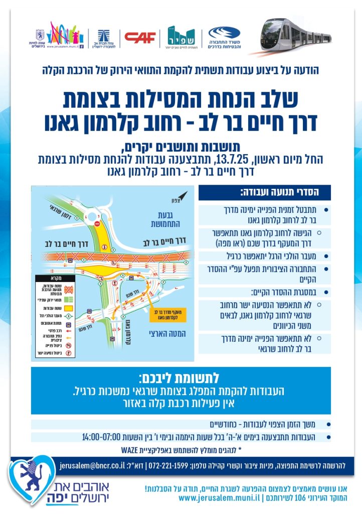 עדכון אנו ממשיכים בעבודות התשתית להקמת התוואי הירוק של הרכבת הקלה בירושלים- שלב הנחת המסילות. החל מיום ראשון 19.10.25, כ"ז בתשרי ה-תשפ"ו, תתבצענה עבודות להנחת מסילות בצומת הרחובות כנפי נשרים- רוברטו בקי הסדרי תנועה: תתבצע הסטה של נתיבי הנסיעה בצומת תנועת כלי הרכב והולכי הרגל תתאפשר כרגיל התחבורה הציבורית תפעל כרגיל משך הזמן הצפוי לעבודות-