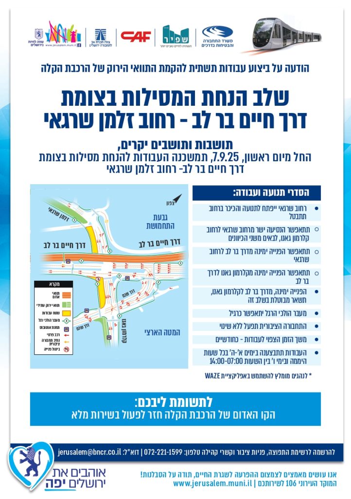 אנו ממשיכים בעבודות התשתית להקמת התוואי הירוק של הרכבת הקלה בירושלים- שלב הנחת המסילות. החל מיום ראשון 28.9.25, ו' בתשרי ה-תשפ"ו, תתבצענה עבודות להנחת מסילות בצומת הרחובות כנפי נשרים- רוברטו בקי הסדרי תנועה: תתבצע הסטה של נתיבי הנסיעה בצומת תנועת כלי הרכב והולכי הרגל תתאפשר כרגיל התחבורה הציבורית תפעל כרגיל משך הזמן הצפוי לעבודות- כחודשיים