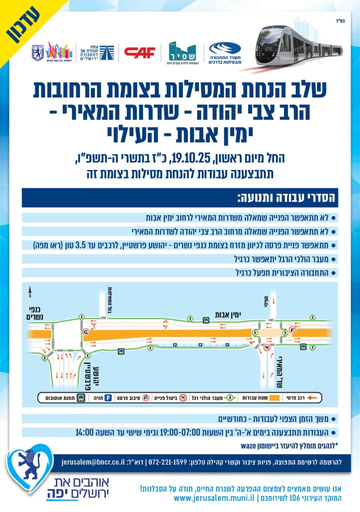 עדכון אנו ממשיכים בעבודות התשתית להקמת התוואי הירוק של הרכבת הקלה בירושלים- שלב הנחת המסילות. החל מיום ראשון 19.10.25, כ"ז בתשרי ה-תשפ"ו, תתבצענה עבודות להנחת מסילות בצומת הרחובות כנפי נשרים- רוברטו בקי הסדרי תנועה: תתבצע הסטה של נתיבי הנסיעה בצומת תנועת כלי הרכב והולכי הרגל תתאפשר כרגיל התחבורה הציבורית תפעל כרגיל משך הזמן הצפוי לעבודות-